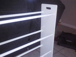 I saw a colorful fabric bookshelf at Big Lots that I thought would be great to have around for the grandkids, but for $30 it wasn't high on my priority list. I browsed at the DI a few times and eventually found a broken shoe rack (or maybe it was a vhs tape rack) but that gave me the dowels I needed for only $2.